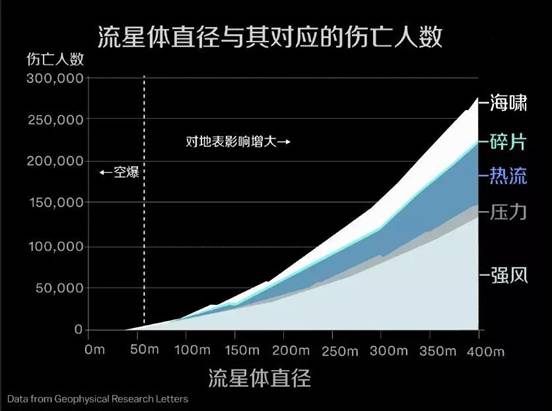 2017年,《地球物理研究快报》(Geophysical Research Letters)发表了一篇分析小行星撞击可能造成的人员伤亡的文章,这项研究得出结论:“陨石坑、地震和喷出物沉积等造成的影响,仅仅占全部破坏的一小部分。”最大的伤亡来源于撞击气浪产生的风。